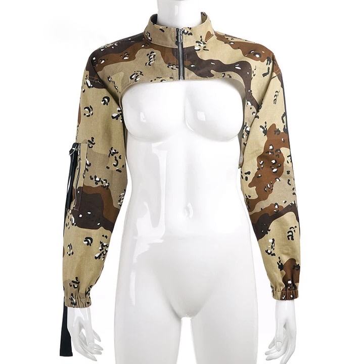 Camouflage, cut out, zip-up, jacket, a knockout look that wins every time. Pair with sportsbra or tank top.