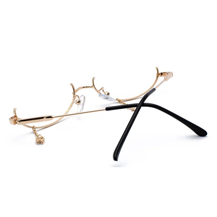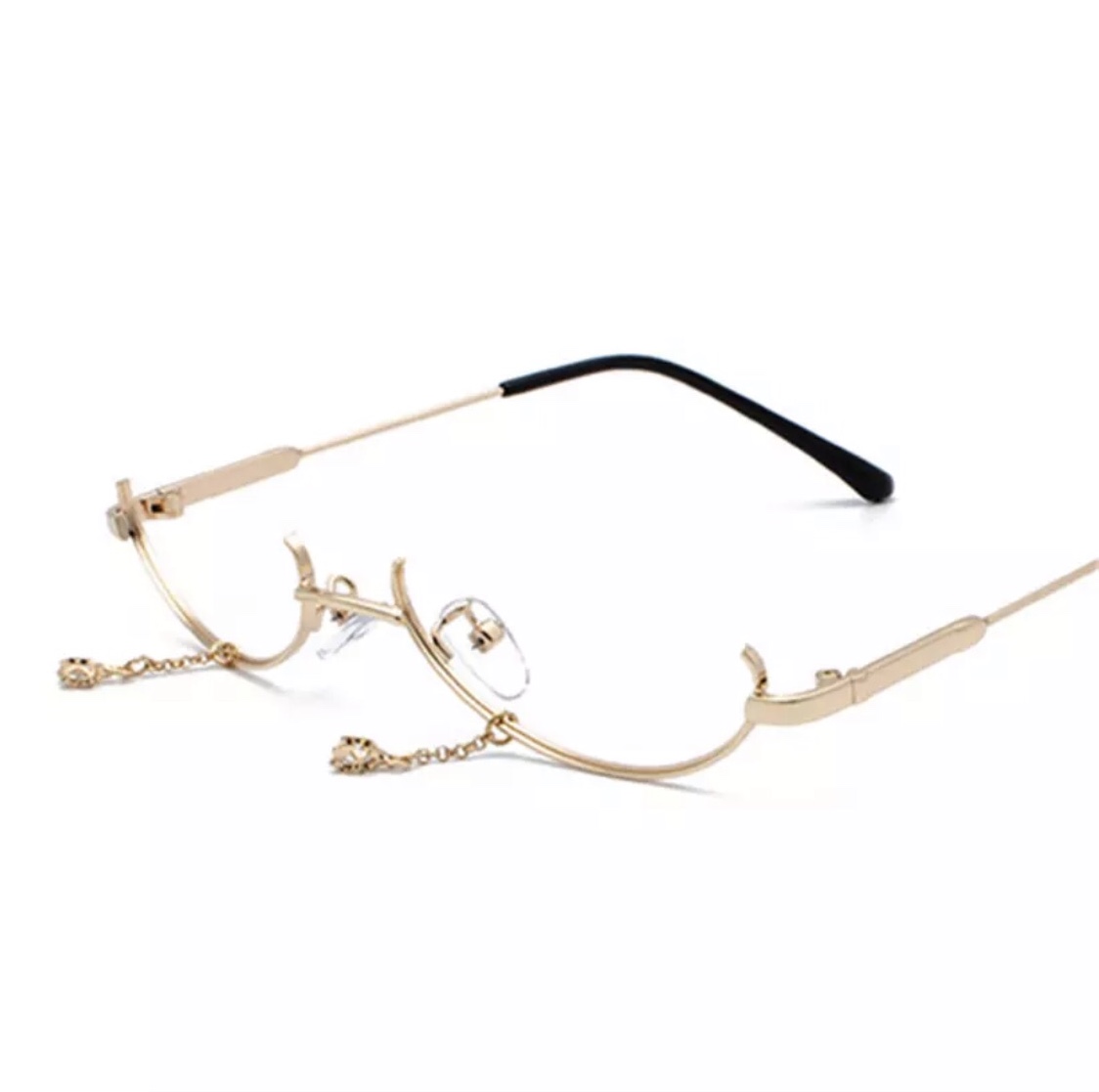 Unique, luxury, gold, frameless, eyewear w/ dangling teardrop pendant.