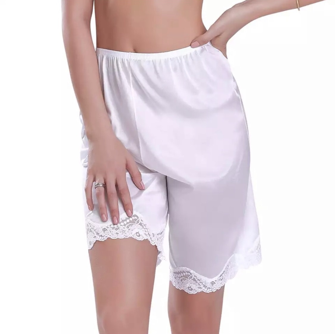 Shiny silk shorts w/ lace detail that falls mid-thigh for a sporty rich look.